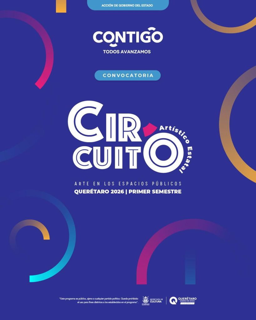 La Secretaría de Cultura del estado (Secult) lanzó la convocatoria “Circuito Artístico Estatal: arte en los espacios públicos, Querétaro 2026, primer semestre”, dirigida a artistas, colectivos y agrupaciones artísticas interesados en acercar las diversas expresiones artísticas y culturales a la población queretana a través de presentaciones y actividades en plazas, parques y espacios públicos de los 18 municipios de la entidad.